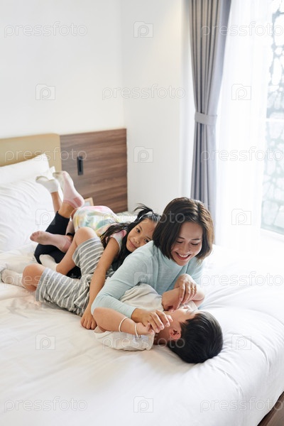Братья и сестры играют с матерью