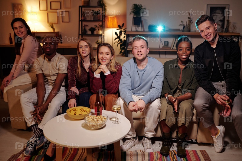 Межкультурные друзья отдыхают на диване и вместе смотрят интересный фильм