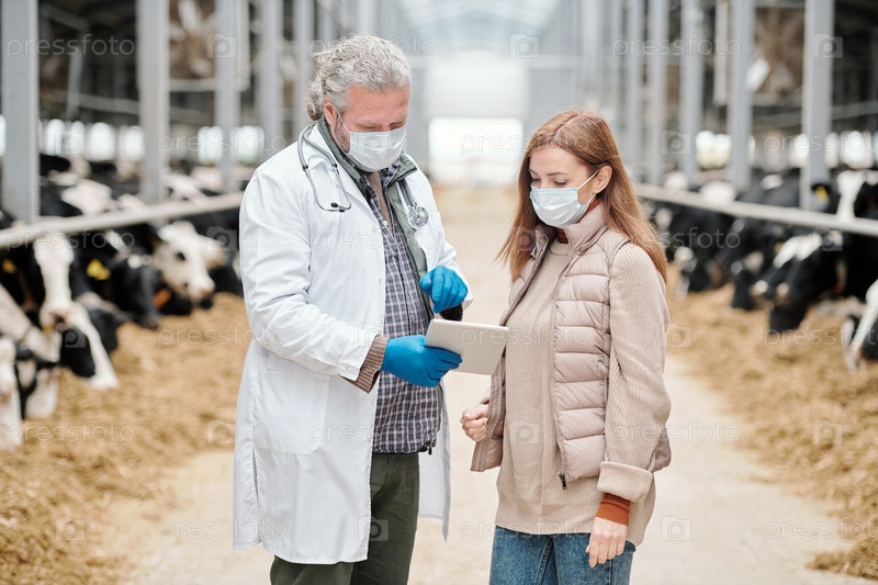 Зрелый ветеринар-мужчина, показывающий медицинскую информацию в Интернете фермерскому работнику