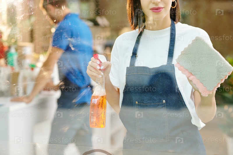 Женщина чистит окна в кафе