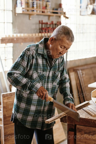 Плотник, использующий японскую пилу