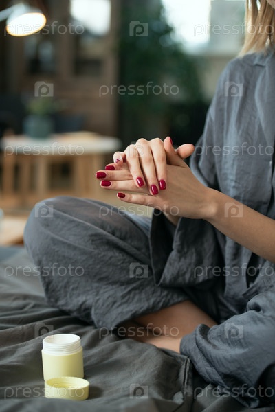 Молодая женщина наносит натуральный косметический продукт ручной работы на свои руки