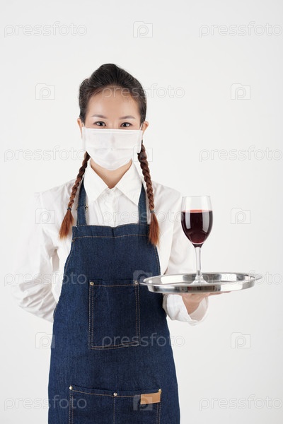 Официантка подает вино клиенту
