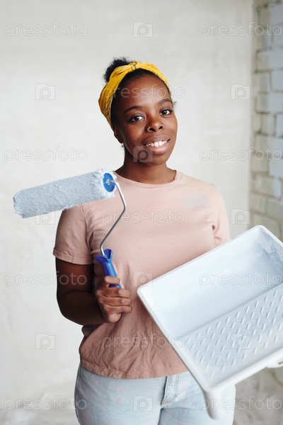 Счастливая молодая африканская женщина с пайнтроллером смотрит на вас во время ремонтных работ дома или квартиры