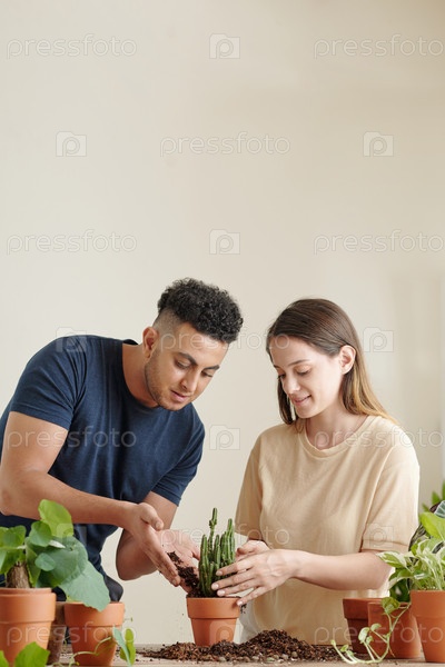 Мужчина помогает девушке с репотингом цветов