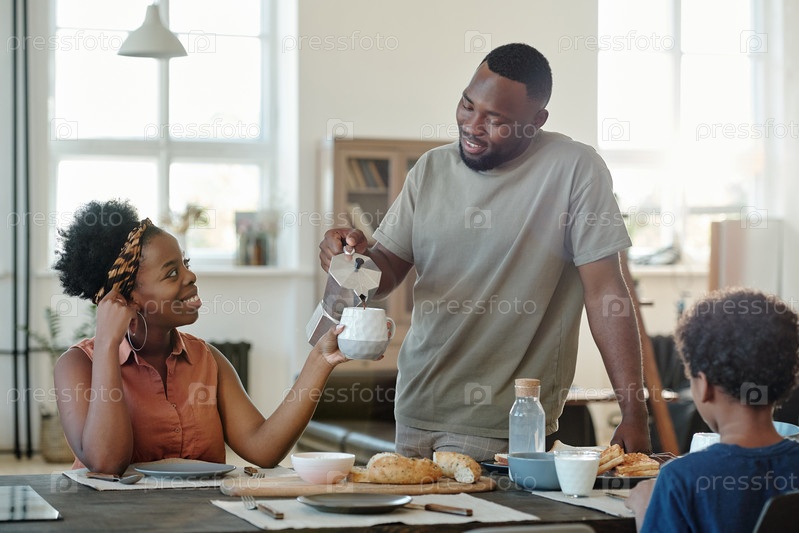 Молодой африканский мужчина стоит у кухонного стола, наливая чай или кофе в чашку своей жены