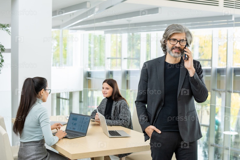 Уверенный зрелый бизнесмен в формальной одежде разговаривает с клиентом по мобильному телефону