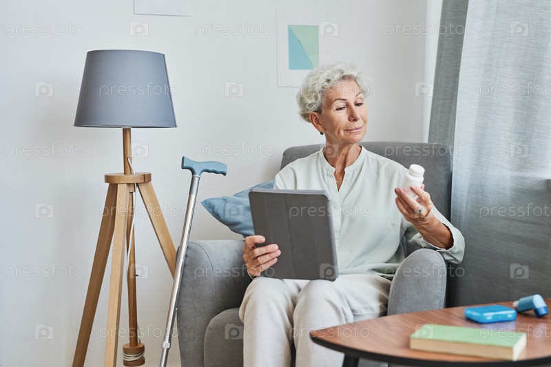 Старшая женщина читает рецепт на таблетки