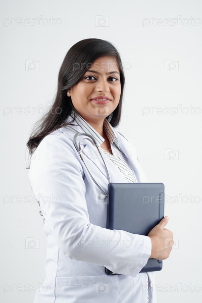 Улыбающийся врач с планшетным компьютером
