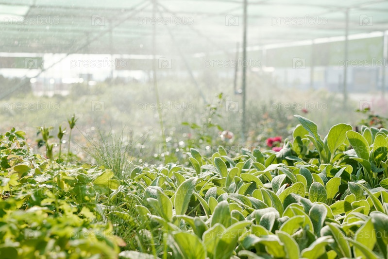 Цветы и кустарники с зелеными листьями орошаются ирригационной системой внутри большой теплицы