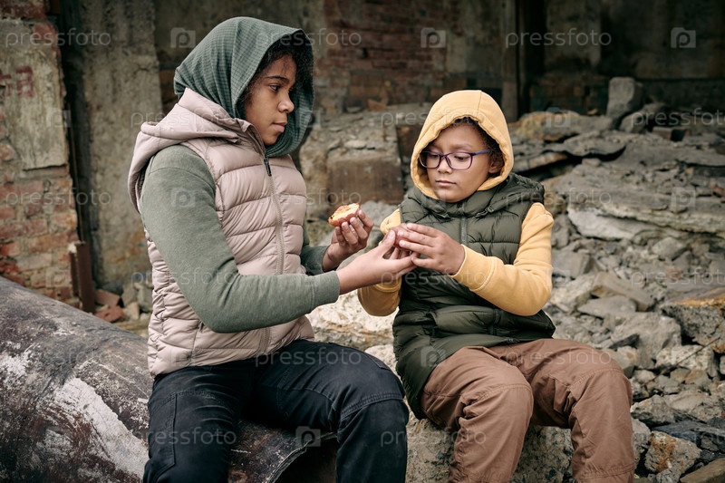 Две голодные девочки делятся персиком, сидя на руинах здания