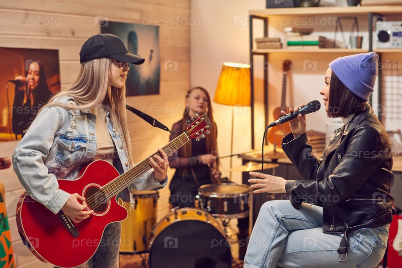 Девушка поет среди своих друзей в студии