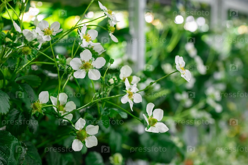 Саженцы садовой клубники с зелеными листьями и белыми лепестками растут внутри вертикальной фермы