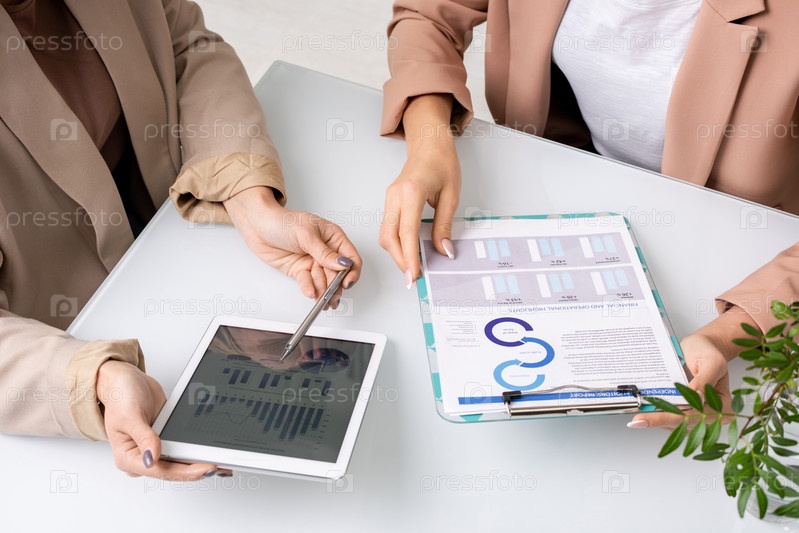 Руки двух молодых деловых женщин, анализирующих и обсуждающих диаграммы