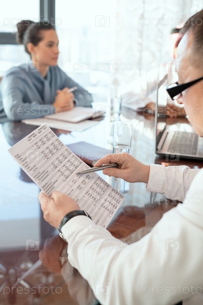 Зрелый мужской делегат в формальной одежде и очках просматривает документ