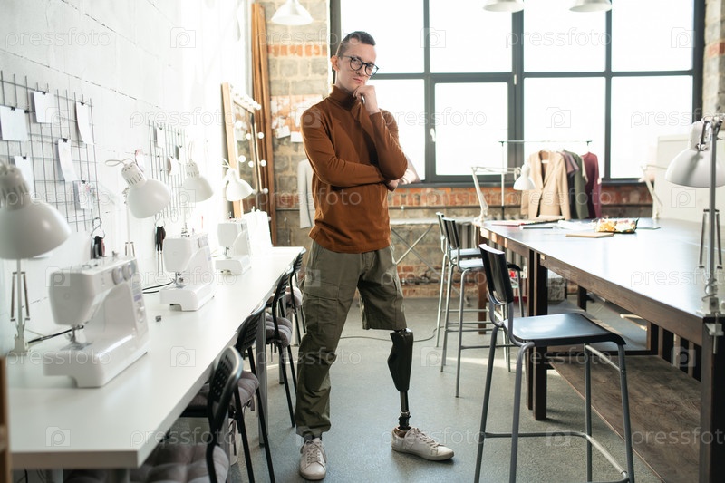 Молодой серьезный дизайнер моды или портной с протезом вместо одной ноги, стоящий в мастерской
