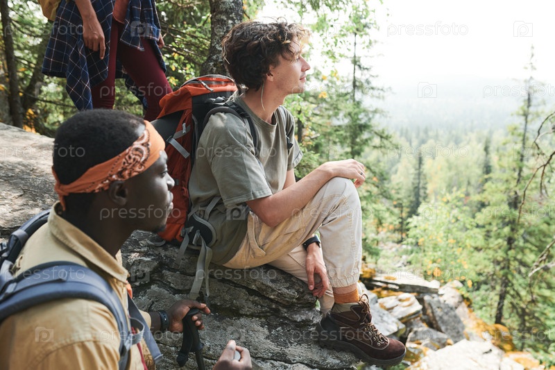 Группа молодых мультиэтнических туристов находится на большом камне в горах и наслаждается красотой природы вокруг них
