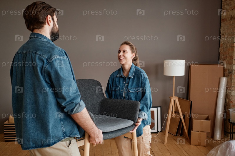 Горизонтальный снимок современного молодого человека и влюбленной женщины, переезжающих в новую квартиру вместе с мебелью