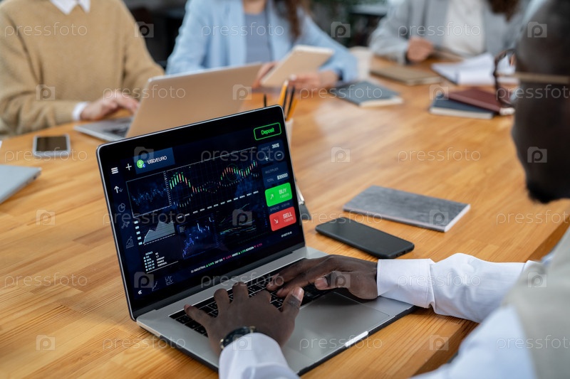 Молодой африканский финансист сидит перед ноутбуком во время работы
