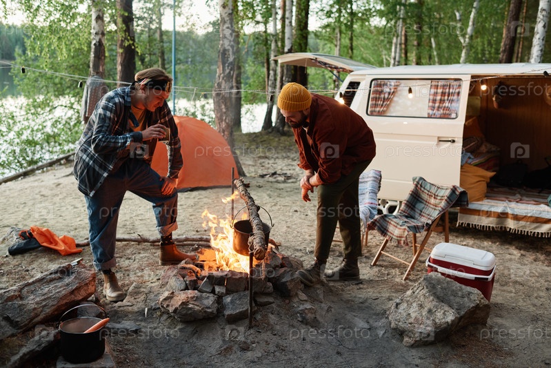 Мужчины готовят еду на костре