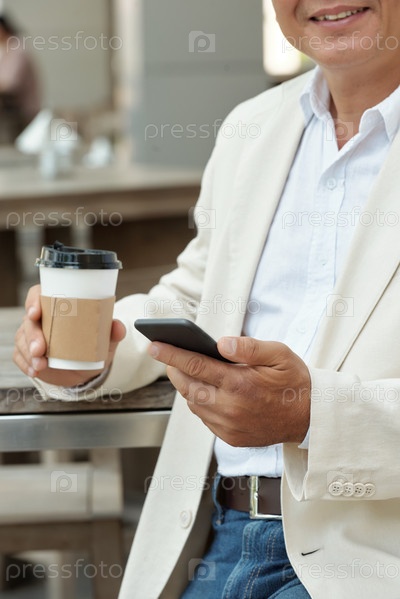 Зрелый мужчина с гаджетом в уличном кафе