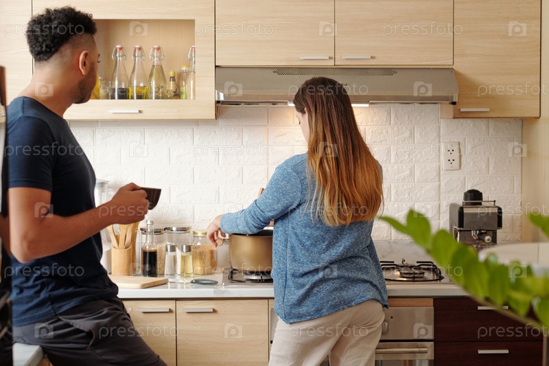 Глядя на жену мужчины, готовящую еду