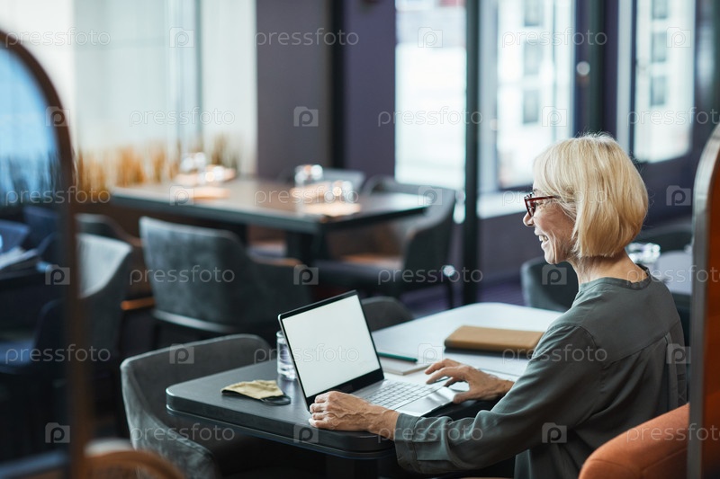 Позитивная зрелая деловая женщина, разговаривающая через приложение видеоконференцсвязи