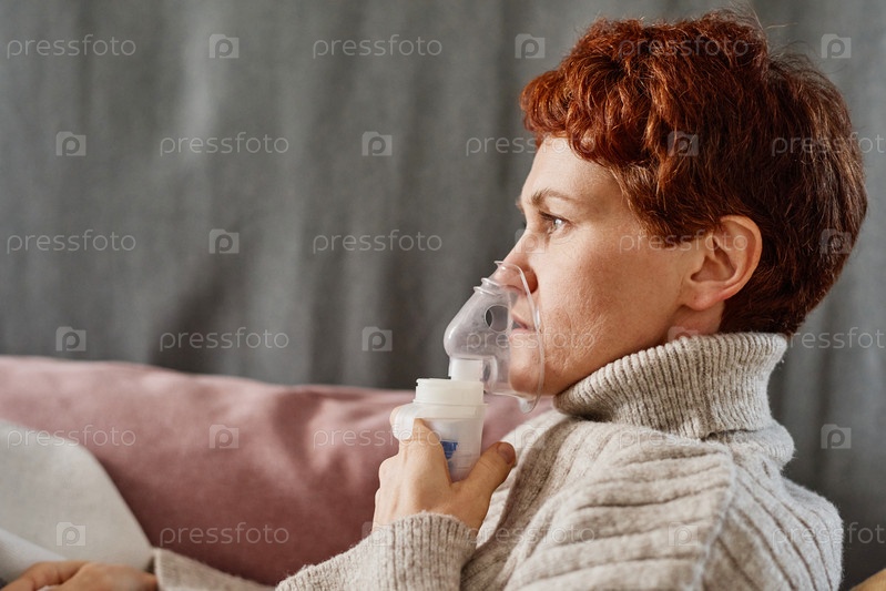 Горизонтальный боковой вид Близкий снимок зрелой женщины, страдающей гриппом остается дома и отдыхает на диване с помощью небулайзера