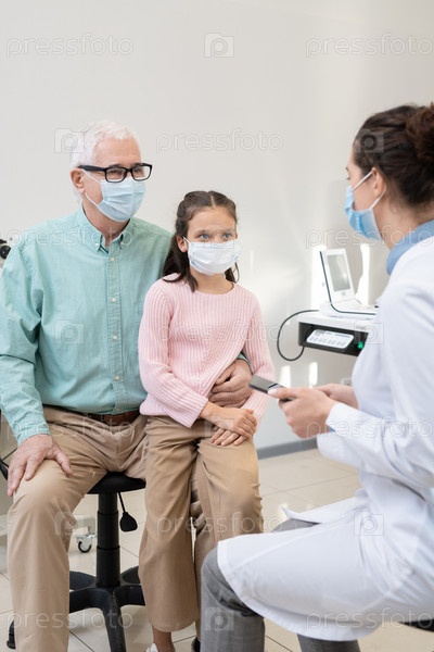 Пожилой мужчина и его внучка в защитных масках консультируются с оптиком