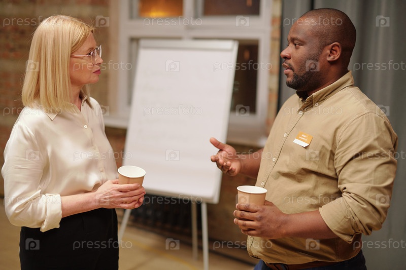 Уверенная в себе зрелая консультантка с выпивкой слушает одного из своих пациентов и смотрит на него