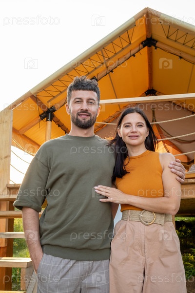 Счастливая молодая пара стоит напротив палаты для глампинга