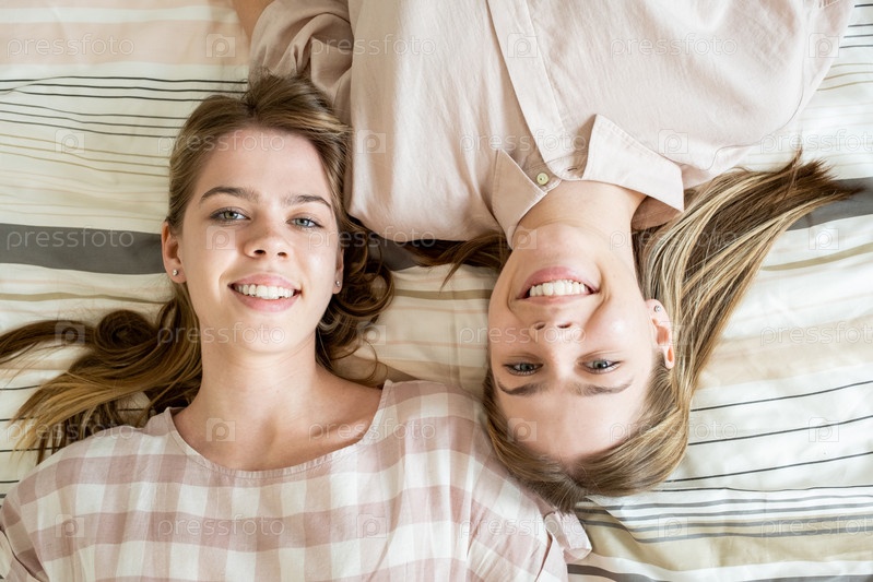 Две веселые блондинки-подростки отдыхают на кровати в свободное время