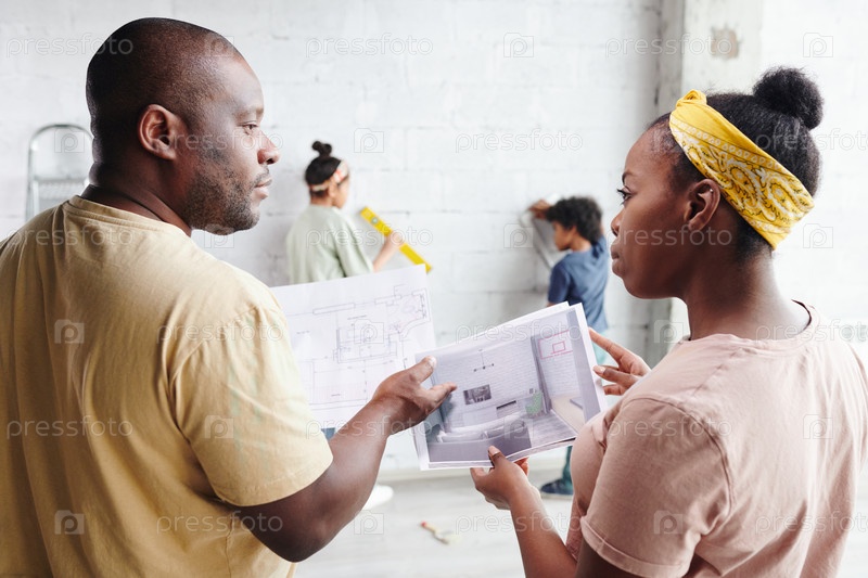 Африканская пара в повседневной одежде обсуждает документы с проектом и интерьером гостиной