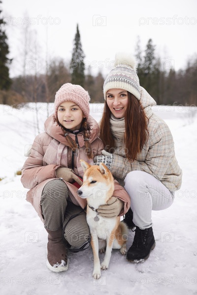 Портрет счастливой семьи с собакой в зимнем парке