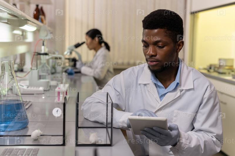 Молодой ученый африканской этнической принадлежности смотрит на мышей в стеклянных коробках