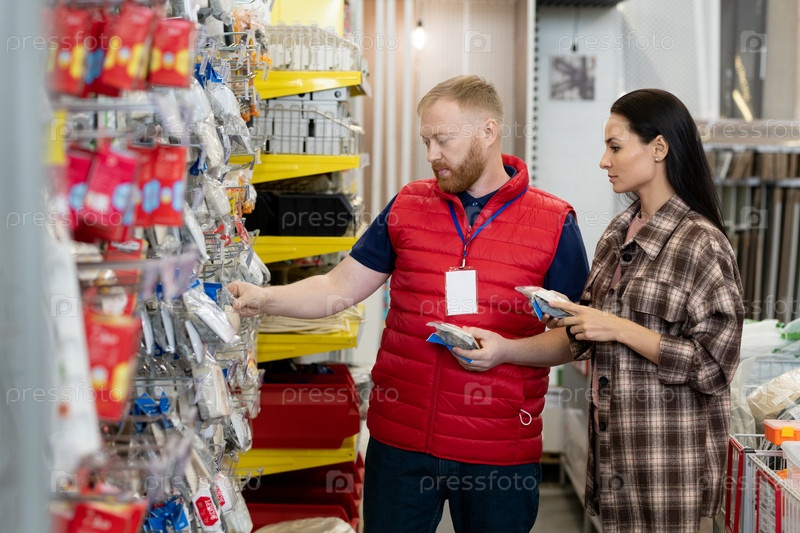 Менеджер по продажам помогает молодой женщине выбирать мужской товар