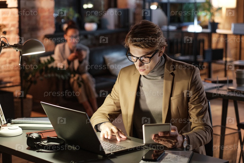 Серьезный молодой бизнесмен в куртке, сидящий за столом при свете лампы и анализирующий онлайн-данные на устройствах