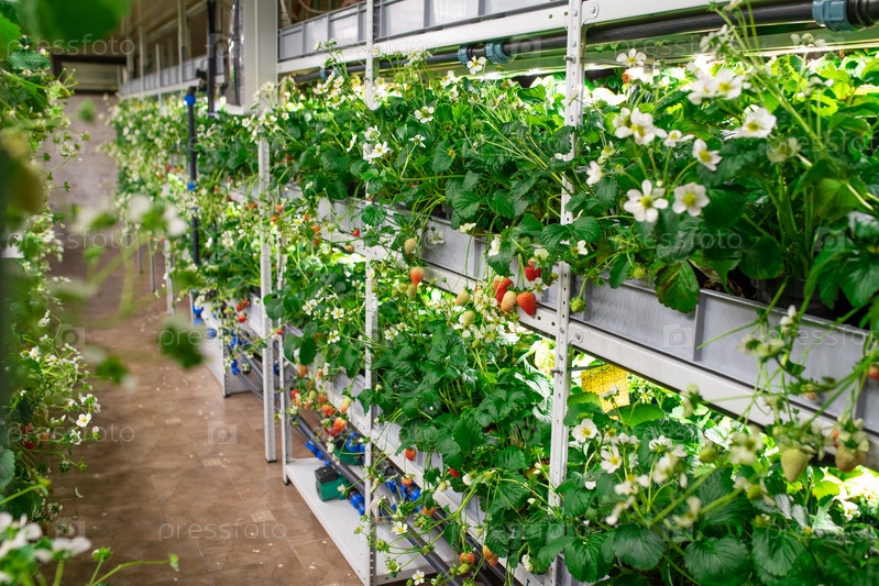 Ряд саженцев различных видов садных клубники, растущих на полках вертикальной фермы