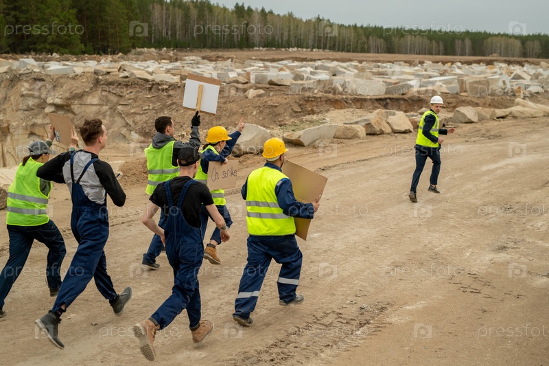 Группа недовольных строителей с плакатами, бегущих за подрядчиком