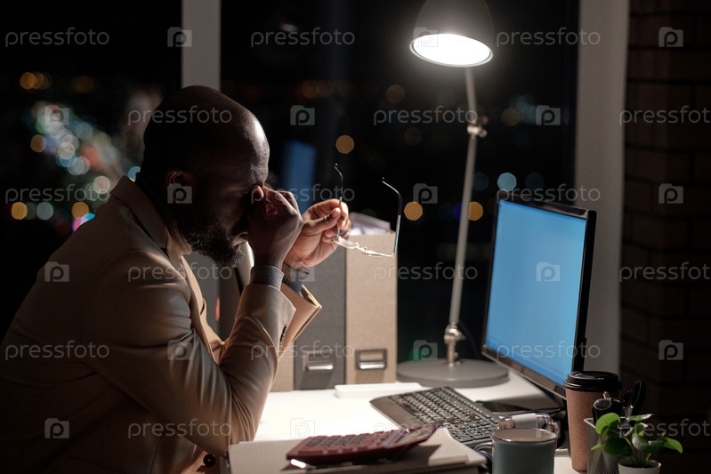 Молодой уставший бизнесмен прикасается к лицу во время сети