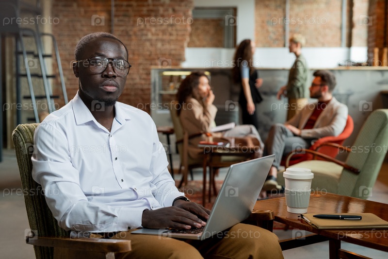 Серьезный африканский бизнесмен, держащий руки на клавиатуре ноутбука