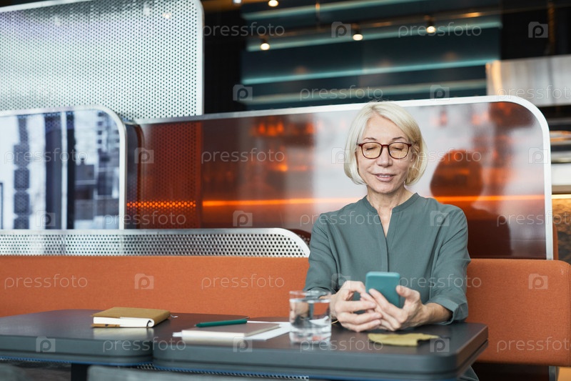 Блондинка проверяет телефон в кафе