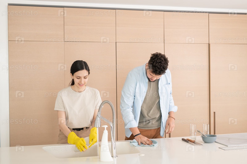 Красивая молодая женщина в желтых резиновых перчатках стирает тарелки после завтрака, стоя у раковины