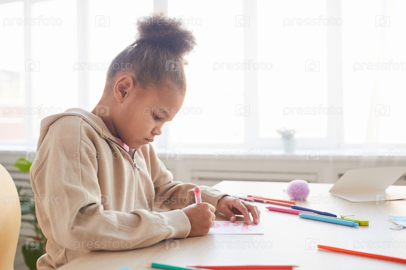 Афроамериканская девушка занимается ремесленничеством за рабочим столом