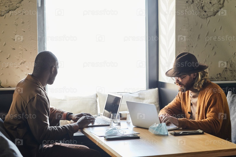Два мужчины работают за столом в кафе
