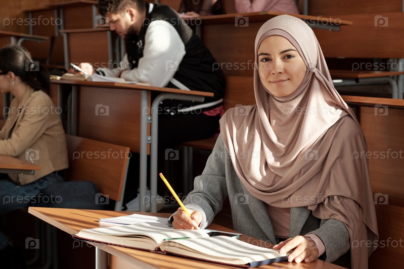 Молодая улыбающаяся студентка в хиджабе сидит за столом на уроке в лекционном зале и читает книгу