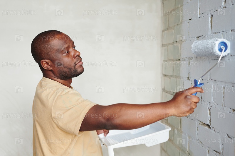 Молодой африканский мужчина в бежевой футболке держит болеутоляющий прибор, рисуя кирпичную стену белым цветом