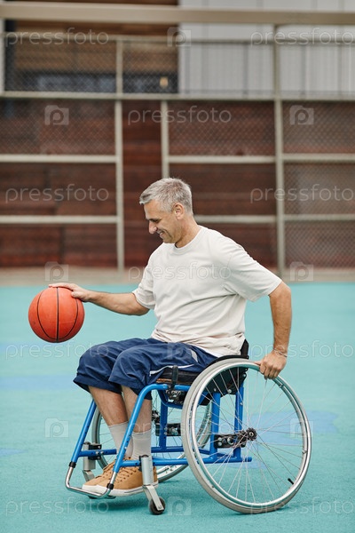 Мужчина с инвалидностью играет в баскетбольную игру