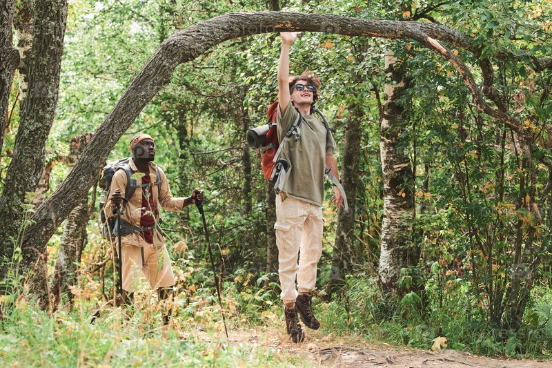 Позитивный молодой парень в солнцезащитных очках прыгает на ствол дерева, гуляя с черным другом по лесу