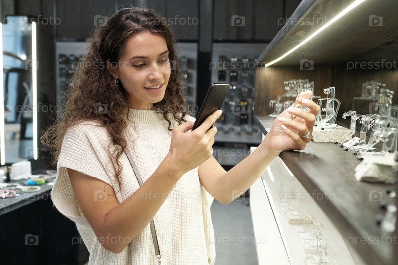 Счастливая молодая брюнетка-покупательница со смартфоном, выбирающая новые серьги